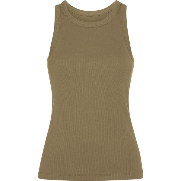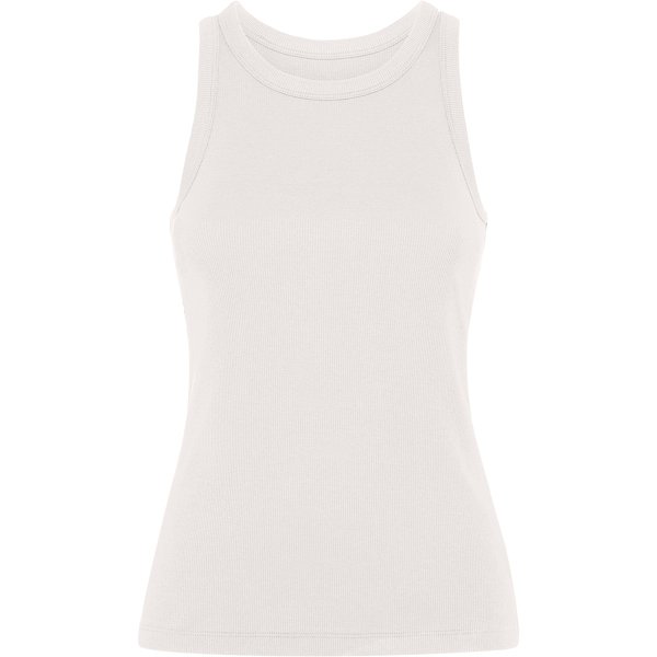 Camiseta de mujer sin mangas en punto canalé. Cuello y sisas con vivo ancho del mismo tejido, reforzado con doble costura. Bajo con doble costura.